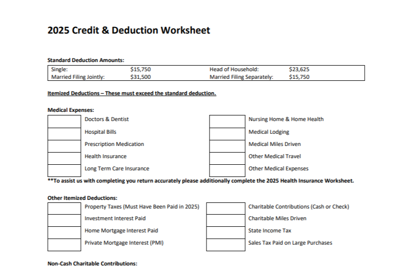 The 2025 Credit & Deduction Worksheet helps gather details about deductions, credits, and qualifying expenses that may reduce your tax liability. Completing this worksheet allows us to identify eligible deductions and ensure your return is prepared accurately.